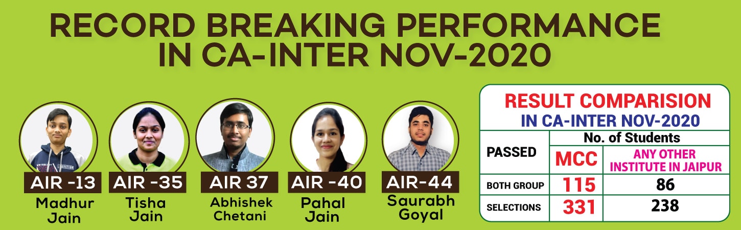 • This scholarship can be availed only after exclusively joining MCC for CA Intermediate both groups Face to Face or Online live class with in 15 days of CA Foundation results. Also student should not be enrolled in any other institute for intermediate course/subject.